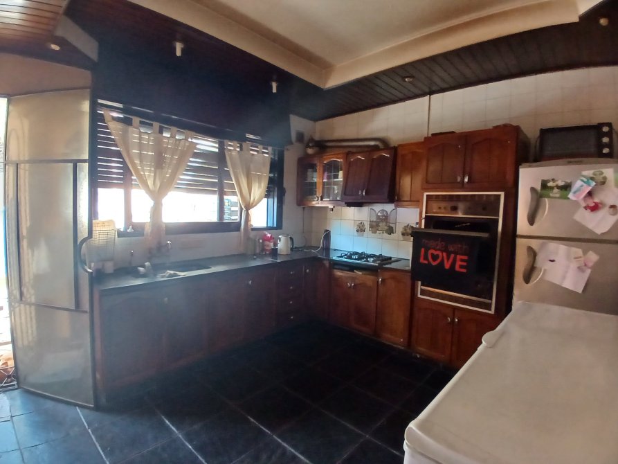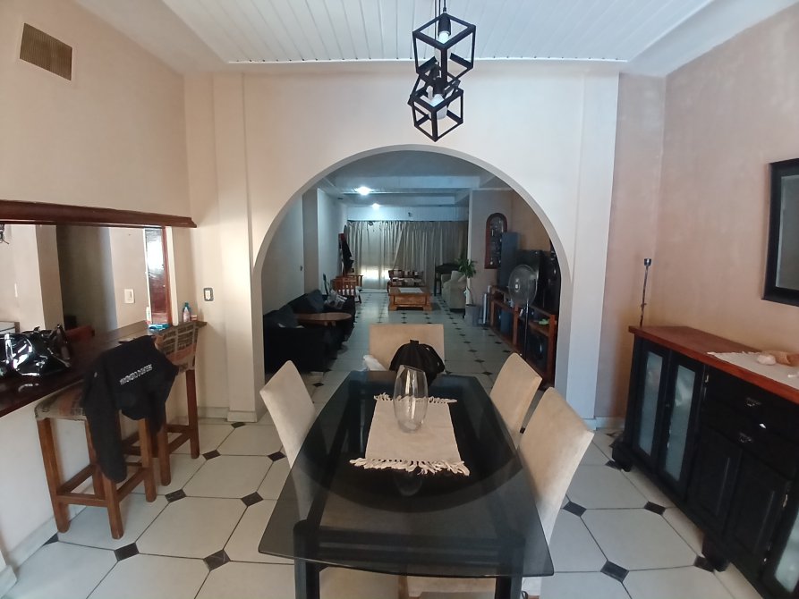 PB: Living-Comedor de 12 x 4.35 con pisos de porcelanato, techos rebajados en madera con luces embutidas, dos ventanas hacia el frente y dos con vista al fondo libre, todas en madera con vidrios repartidos y rejas de protección - Cocina-Comedor de 4.20 x 3.20 con pisos cerámicos, desayunador o pasaplatos con vista hacia el comedor, muebles bajos y alacenas, horno empotrado; sector en desnivel tipo despensa - Toilette con ducha - Hermoso Fondo libre parquizado de 8.66 x 12 con parrilla, palmeras, pisos de lajas, escalera de acceso a amplio balcón aterrazado. Garage, lavadero, y cuarto de guardado