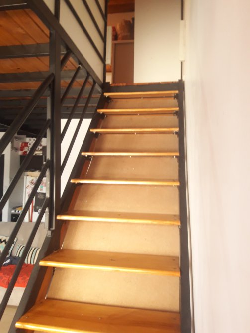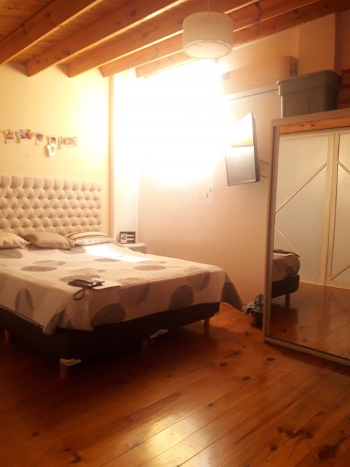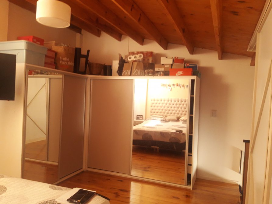 PA: escalera de acceso revestida en madera - Dormitorio Ppal. (con ventanal y placard de puertas espejadas-corredizas) y Segundo Dormitorio (agregado), comunicados entre sí y divididos por moderna puerta corrediza, ambos con techo de madera a la vista y piso de madera.